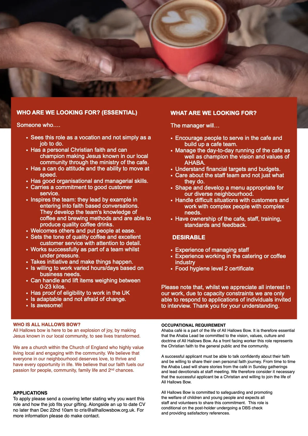 Please do email CV’s and covering letter to Cris@allhallowsbow.org.uk